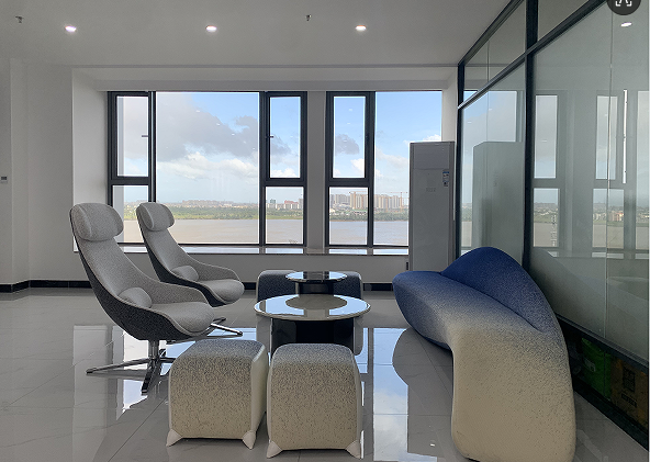 辦公場(chǎng)地從原先的 400 多平擴(kuò)大至 800 多平,新址位于海南省??谑忻捞m區(qū)濱江路 80 號(hào)灃辰外灘 B 座 12 樓,抵達(dá) 12 樓,自動(dòng)門(mén)打開(kāi)首先映入眼簾的就是明亮大氣的登尼特前臺(tái)。