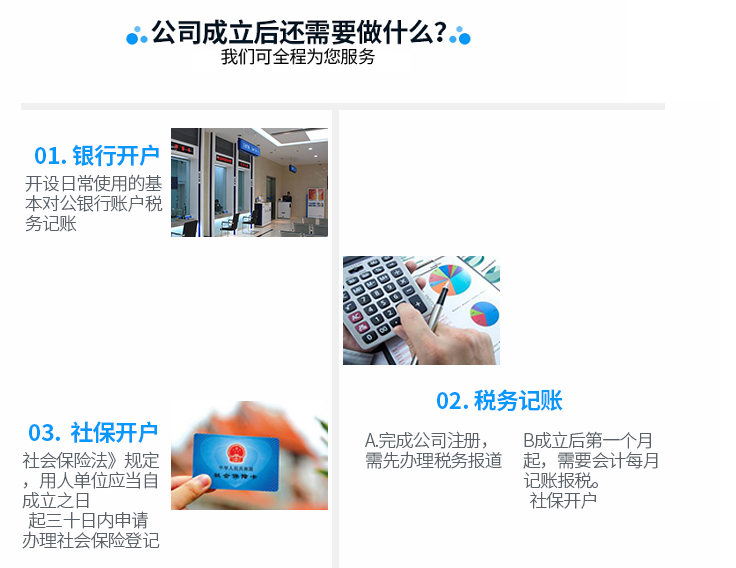 其次是??谛鹿径悇?wù)記賬,已完成新公司注冊(cè)需要先去海口稅務(wù)局辦理稅務(wù)報(bào)道,在成立后一個(gè)月起會(huì)計(jì)每個(gè)月記賬報(bào)稅;再次是??谛鹿旧绫i_(kāi)戶,社會(huì)保險(xiǎn)法規(guī)定,用人單位應(yīng)當(dāng)自成立之日起三十日內(nèi)申請(qǐng)辦理社會(huì)保險(xiǎn)登記,至少繳納一人的保險(xiǎn)。