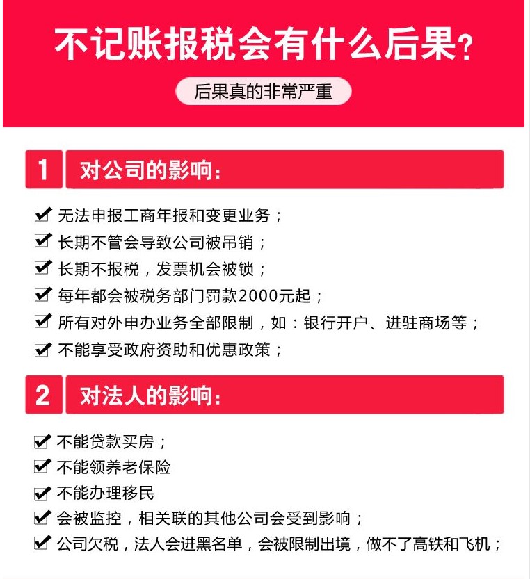 海南公司不記賬報(bào)稅會(huì)有什么后果,首先影響比較大是法人,法人代表無(wú)法貸款買(mǎi)房,不能辦移民、不能領(lǐng)養(yǎng)老保險(xiǎn)等后果、再次是對(duì)于公司的后果也很嚴(yán)重,如產(chǎn)生罰款還被列入異常黑名單所有業(yè)務(wù)都被限制。